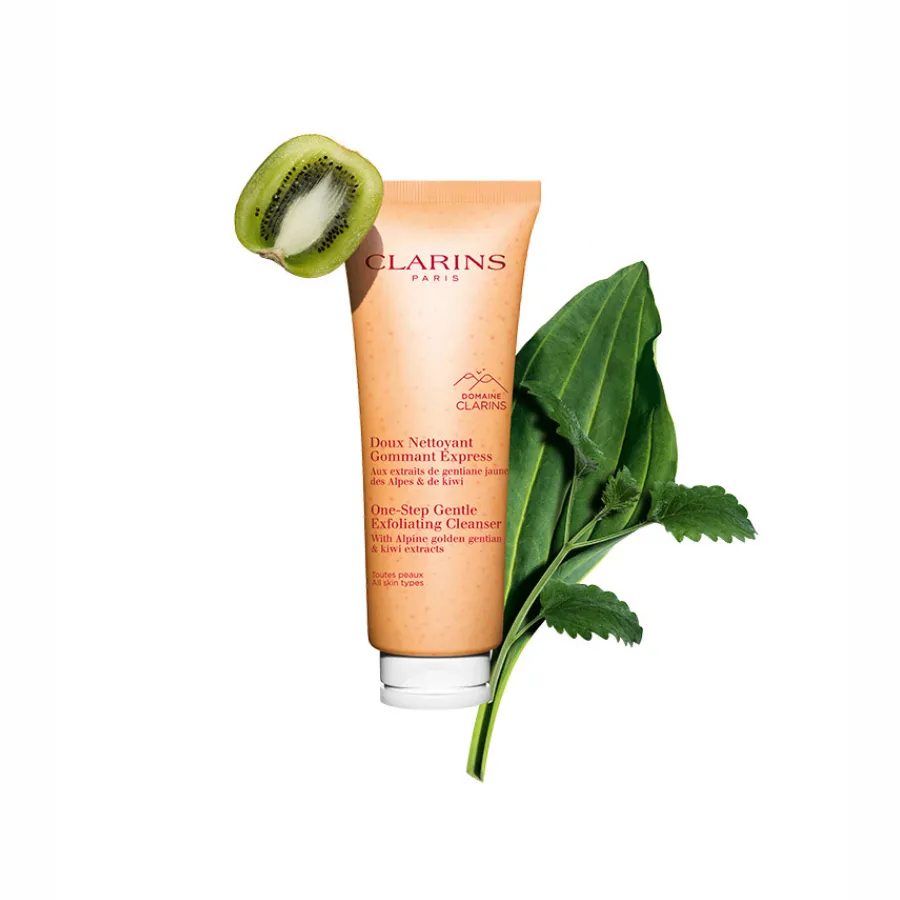 Este produto de limpeza 3 em 1 enriquecido com extratos de ervas dos Alpes, provenientes do Domaine Clarins, limpa e esfolia todos os tipos de pele, num só gesto, preservando o equilíbrio cutâneo.É enriquecido com extratos de saponária bio e kiwi, deixando a pele limpa, fresca e luminosa.O [Complexe Douceur] Clarins com extratos de genciana amarela bio* e cidreira bio* contribui para apaziguar e suavizar a pele.Este gel fresco, enriquecido com microesferas de origem vegetal, transforma-se numa espuma fina e untuosa. O seu leve efeito peeling permite obter uma pele suave e limpa após o enxaguamento.Com vista a reduzir a sua pegada ecológica, Clarins reformulou o produto num tubo ainda mais ecológico, com um invólucro mais leve.