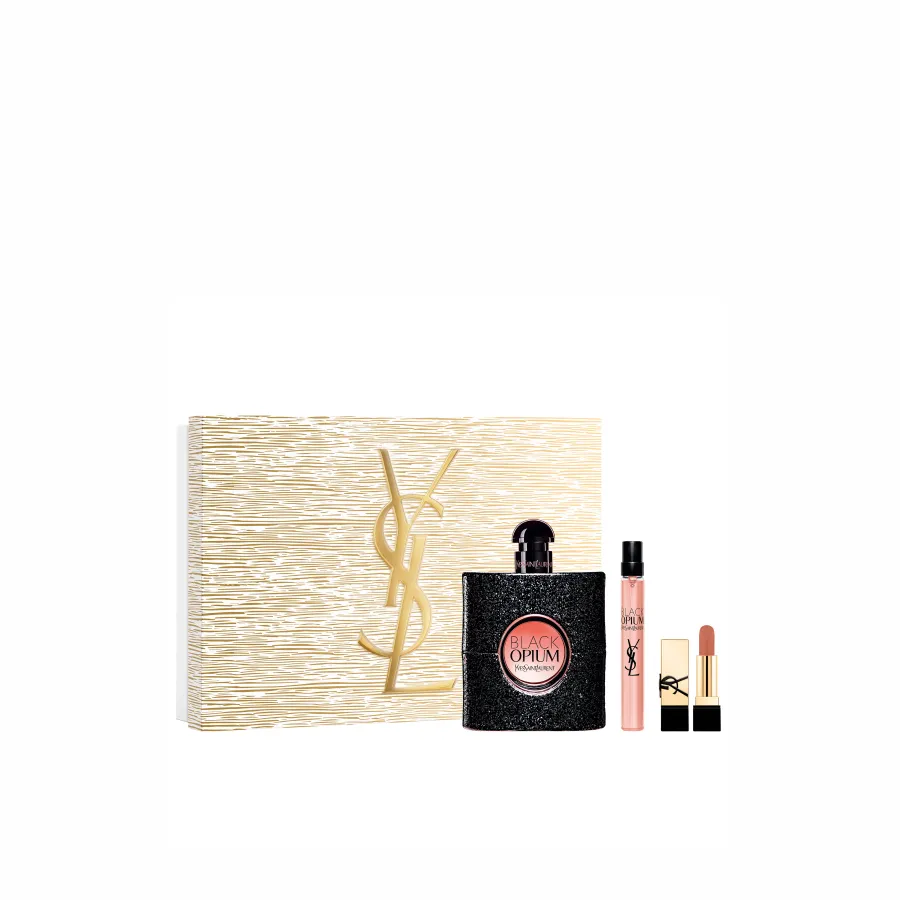 Celebre o Natal com estilo com o Coffret Black Opium de Yves Saint Laurent: Eau de Parfum 90 ml, Tamanho de Viagem 10 ml e Batom Rouge Pur Couture Tamanho de Viagem Nude Muse, um duo de fragrância âmbar sedutora e lábios nude elegante.