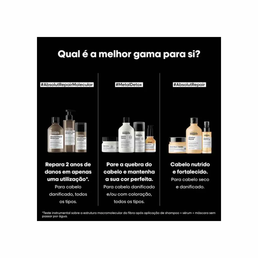 Absolut Repair Molecular Máscara sem passar por água, textura em creme, repara os danos e fortalece o cabelo, protege do calor, adequado a todos os tipos de cabelo danificado.Repara 2 anos de danos em apenas uma utilização*.*Teste instrumental sobre a estrutura macromolecular da fibra após aplicação de shampoo + sérum + máscara sem passar por água.
