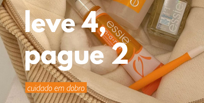Aproveita a promoção leve 4 pague 2 (desconto aplicado às unidades de menor valor) na marca Essie. Promoção válida por tempo limitado.